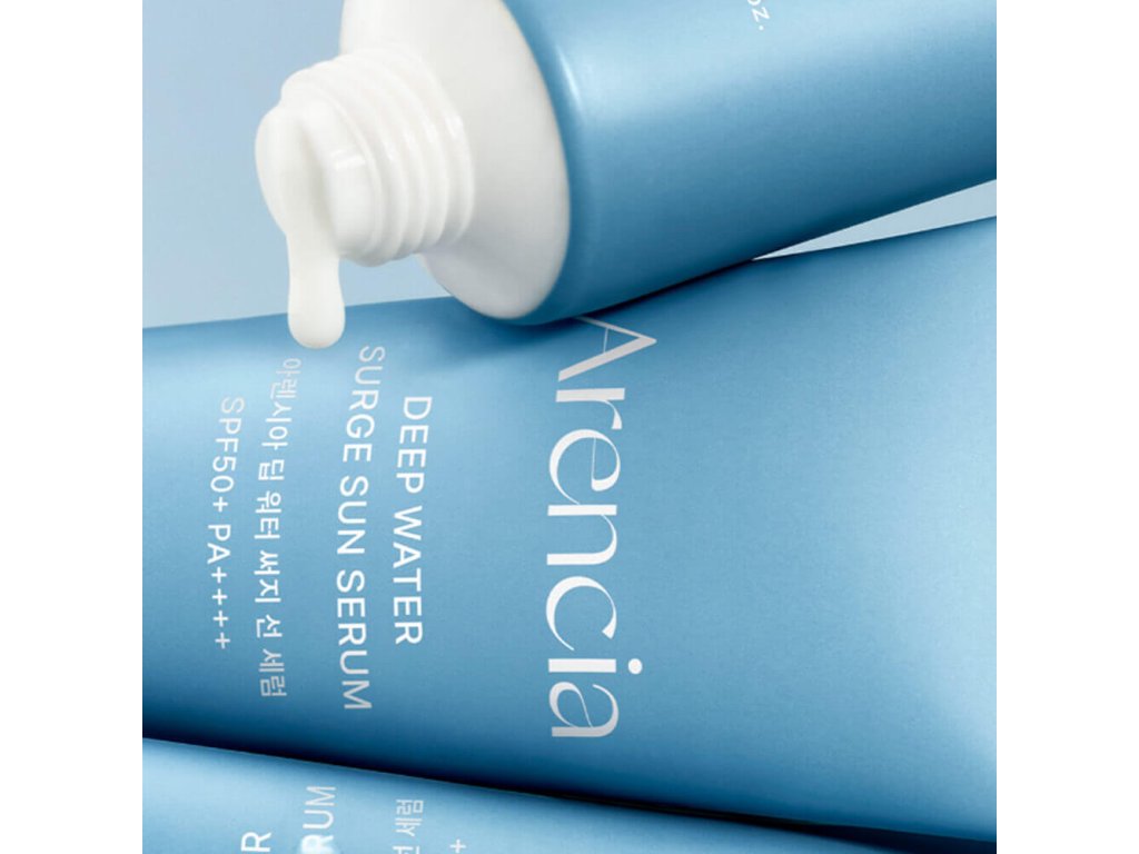 Opalovací sérum s PDRN a peptidy Arencia Deep Water Surge Sun Serum SPF50+ PA++++ zabraňuje vzniku pigmentových skvrn a neutralizuje agresivní působení ultrafialového záření, chrání kolagenová vlákna před poškozením a pomáhá zachovat mladistvý vzhled pleti.