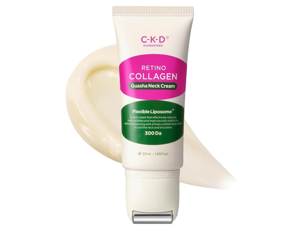 Krém na krk CKD Retino Collagen Guasha Neck Cream je speciálně vyvinutý pro jemnou pokožku krku a dekoltu. Kombinuje účinky retinalu a hydrolyzovaného kolagenu, které pomáhají redukovat vrásky, zpevňují ochabující pokožku a zlepšují její pružnost. Součástí balení je masážní nástroj guasha, který podporuje mikrocirkulaci a zvyšuje vstřebávání aktivních látek.