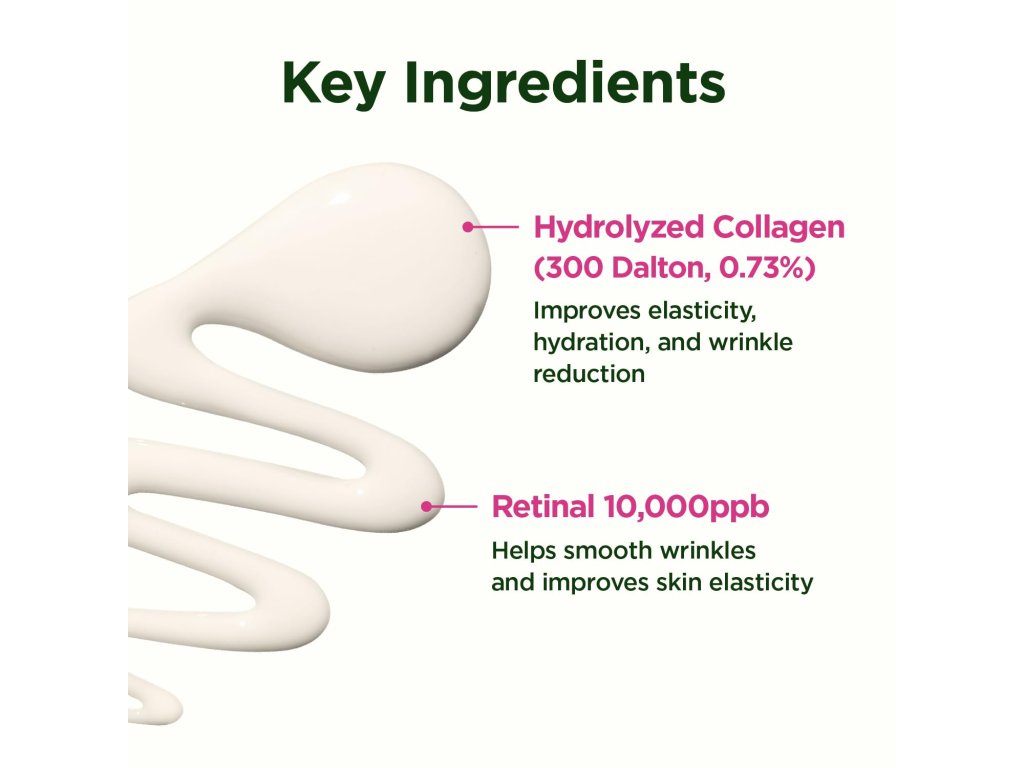 - Nízkomolekulární hydrolyzovaný kolagen (73 %) – intenzivně hydratuje, pomáhá udržet vlhkost, zlepšuje texturu a podporuje regeneraci. Redukuje vrásky způsobené suchostí.