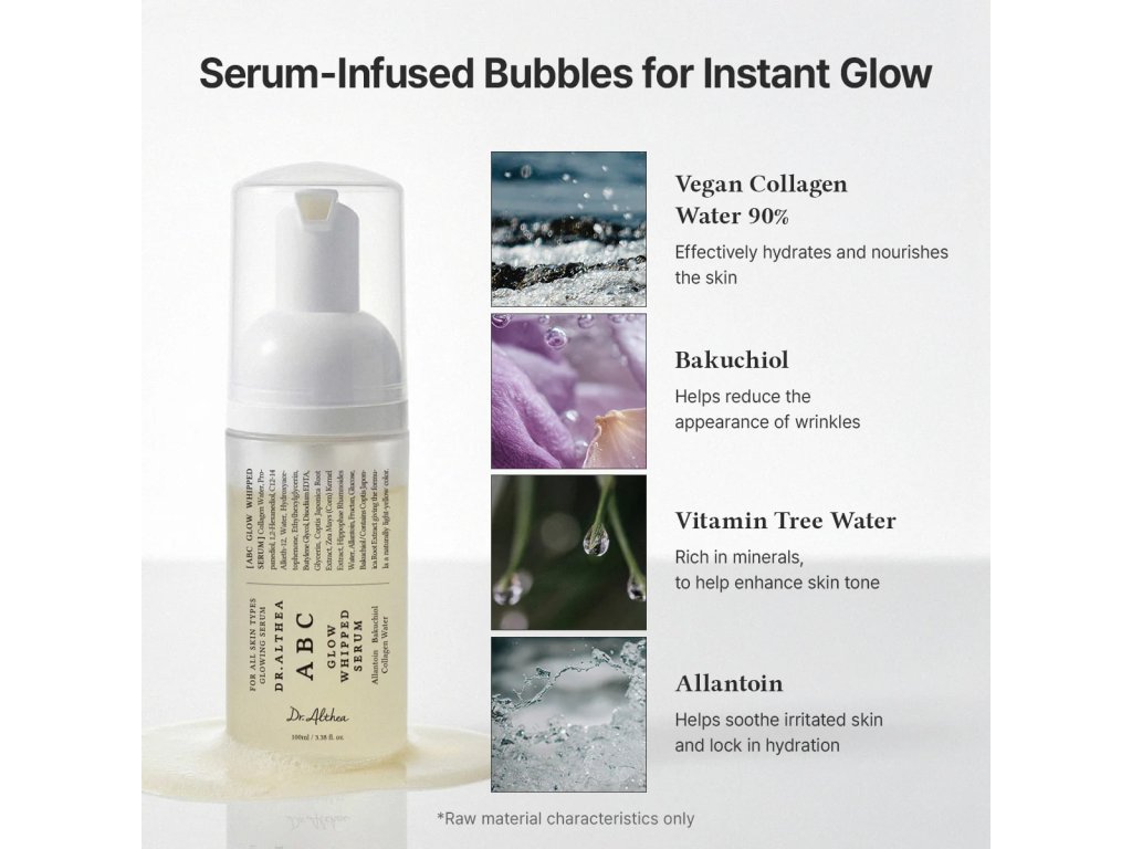 Dr. Althea ABC Glow Whipped Serum je lehké našlehané sérum s jemnou texturou, které okamžitě hydratuje, rozjasňuje a zanechává pleť svěží a hladkou. Rychle se vstřebává bez lepivého pocitu a dodává pleti přirozený glow efekt.