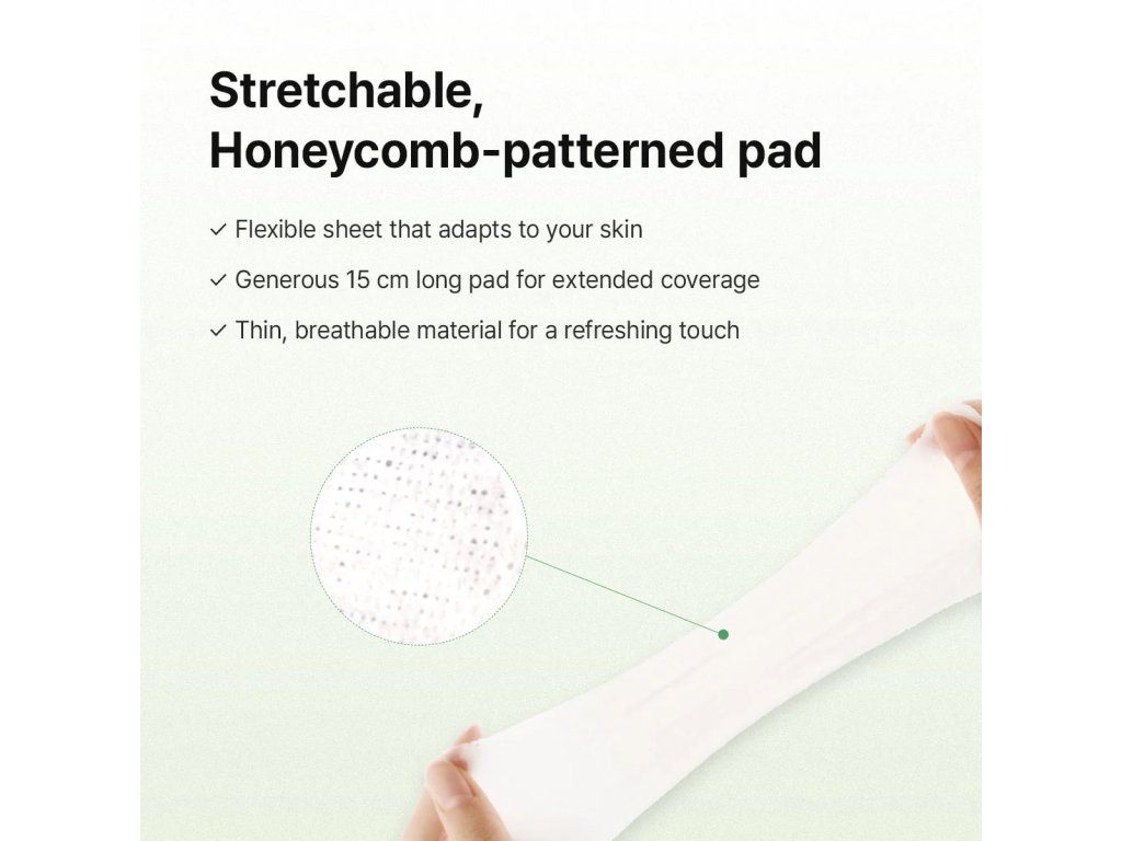 Unikátní elastický materiál umožňuje polštářky roztáhnout až na 15 cm a použít je na jakoukoli oblast obličeje. Díky tomu dokonale přilnou k pokožce a poskytují intenzivní zklidňující péči.