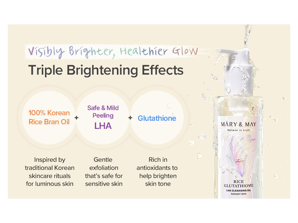 Čisticí olej Mary & May Rice Glutathione LHA Cleansing Oil jemně, ale účinně odstraňuje make-up, opalovací krém i nečistoty z pleti a zároveň pečuje o její zdraví a jas. Díky kombinaci rýžového oleje, glutathionu a LHA kyseliny čistí póry, reguluje tvorbu mazu a zanechává pleť svěží bez podráždění.