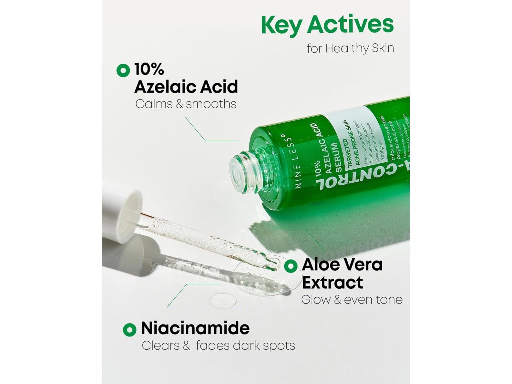 NINE LESS A-Control 10% Azelaic Acid Serum je intenzivní sérum s 10% koncentrací kyseliny azelaové, které pomáhá redukovat pigmentové skvrny, zklidňuje zarudnutí a působí proti nerovnoměrnému tónu pleti. Sérum působí cíleně na oblasti s hyperpigmentací, zabrání jejímu vzniku a zároveň pomáhá vyhlazovat texturu pleti.