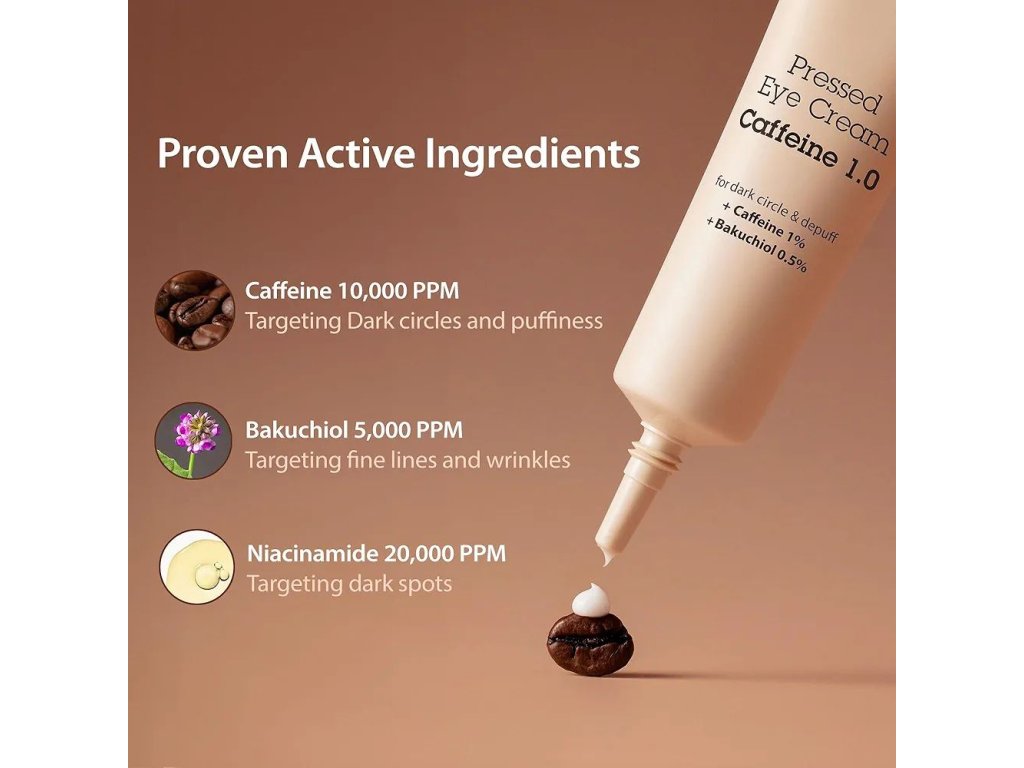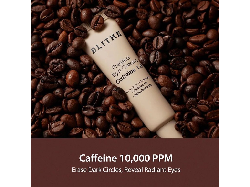 Blithe Pressed Eye Cream Caffeine – Spressovaný oční krém proti tmavým kruhům s kofeinem má výrazný tonizující efekt, pomáhá redukovat tmavé kruhy a otoky pod očima, zbavuje ranního napuchnutí a osvěžuje pohled. Jemně zesvětluje, podporuje rozpuštění hyperpigmentace a stagnujících skvrn. Intenzivně hydratuje a vyhlazuje drobné mimické vrásky. Hustá textura krému, která se rychle vstřebává, okamžitě odstraňuje suchost a připravuje pokožku na líčení – ideální jako podklad pod korektor a make-up.