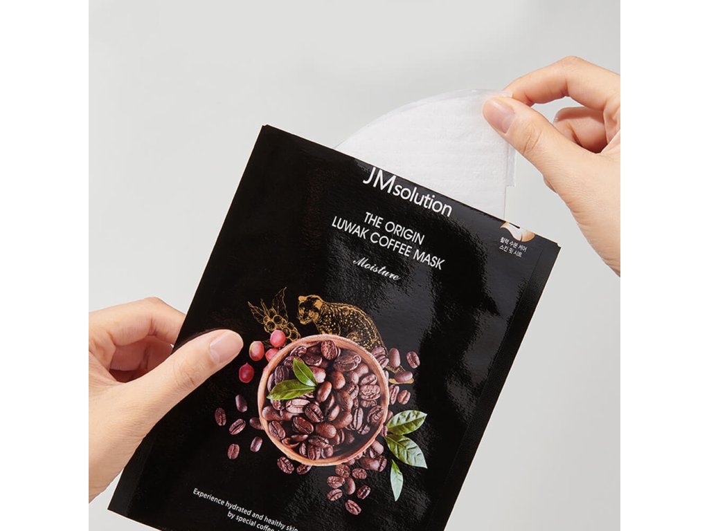 Tonizující plátýnková maska JMsolution The Origin Luwak Coffee Mask hydratuje a osvěžuje, zmírňuje otoky, dodává rovnoměrný tón a hladkou texturu.