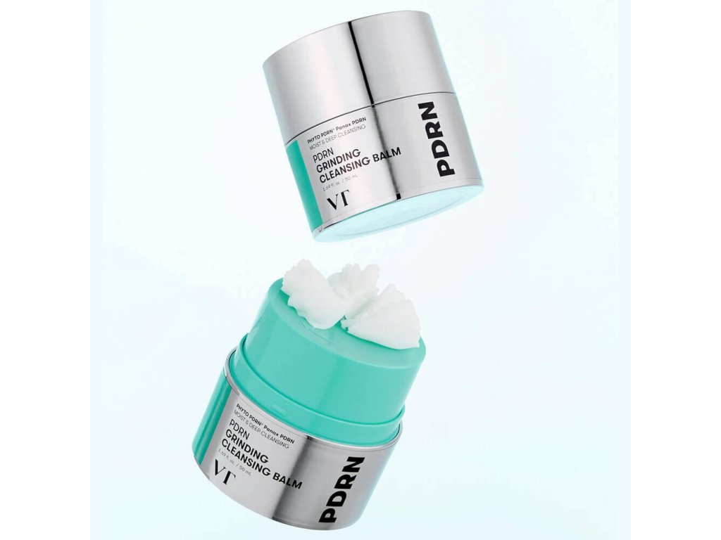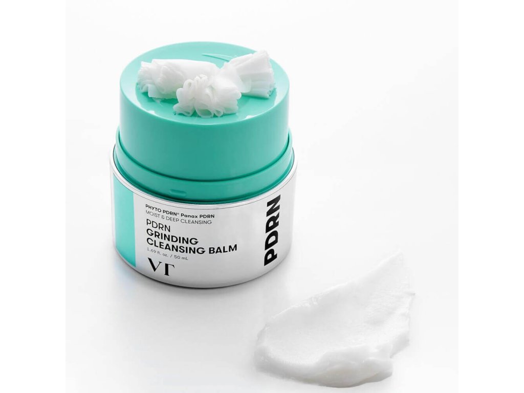 Hydrofilní balzám s PDRN pro čištění pleti VT Cosmetics PDRN Grinding Cleansing Balm jemně, ale účinně odstraňuje i voděodolný make-up, tónovací a opalovací přípravky. Reguluje činnost mazových žláz, absorbuje přebytečný maz, rozpouští černé tečky a zabraňuje tvorbě komedonů.