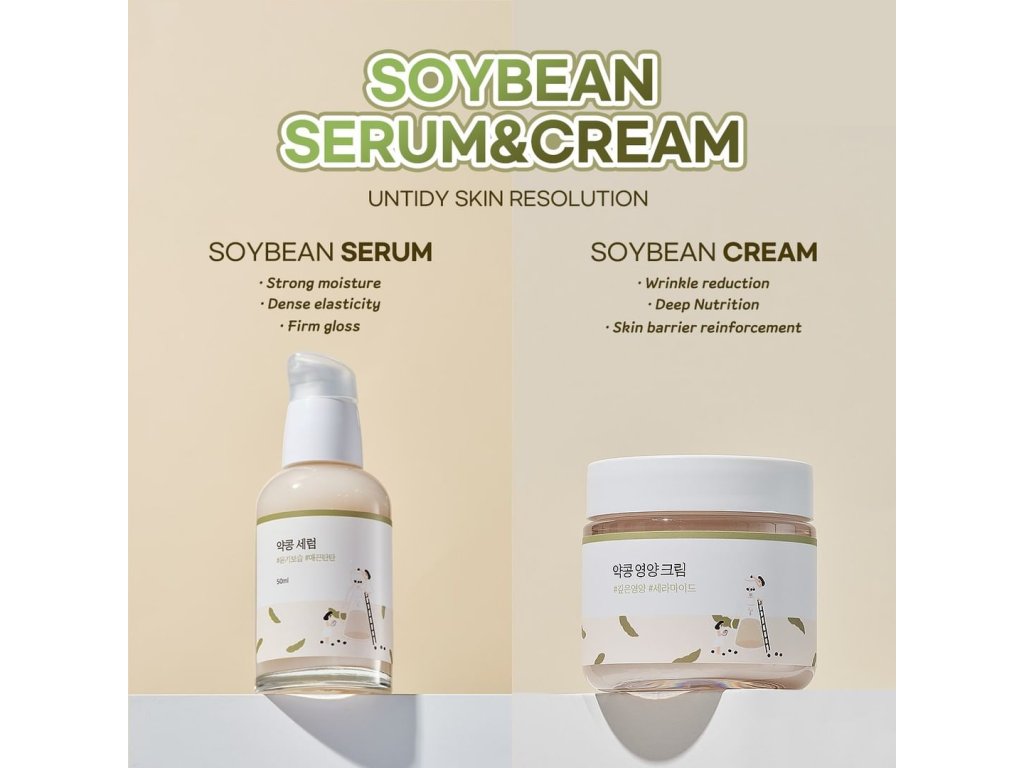 Vyživující sérum s extraktem z černé sóji Round Lab Soybean Serum zjemňuje a vyhlazuje, zlepšuje elasticitu, redukuje výskyt vrásek a zlepšuje texturu pleti. Produkt eliminuje suchost a odlupování, posiluje bariéru zadržující vlhkost a zabraňuje poškození pokožky suchým větrem a změnami teplot.